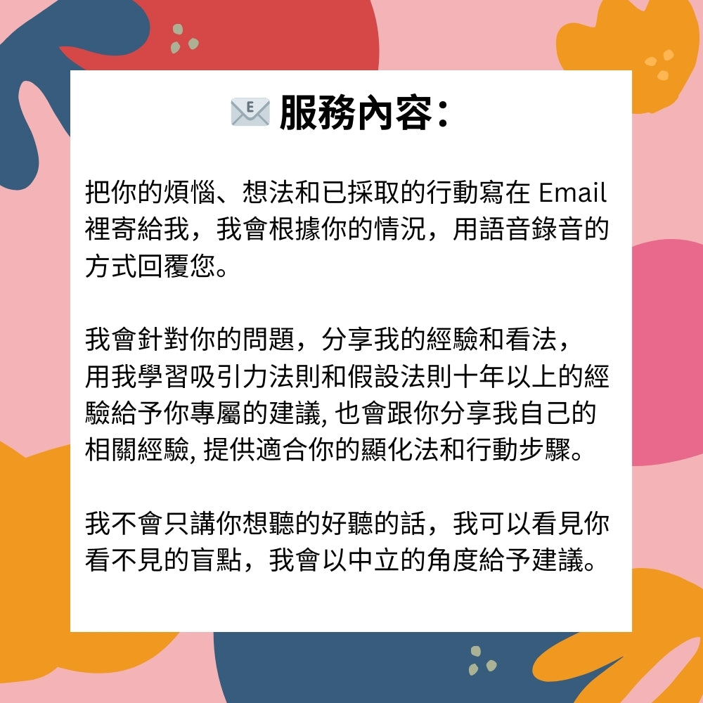 把你的煩惱、想法和已採取的行動寫在 Email 裡寄給我,我會根據你的情況,用語音錄音的方式回覆您。我會針對你的問題,分享我的經驗和看法,用我學習吸引力法則和假設法則十年以上的經驗給予你專屬的建議,也會跟你分享我自己的相關經驗,並提供適合你的顯化方法和行動步驟。我不會只講你想聽的好聽的話,我可以看見你看不見的盲點,我會以中立的角度給予建議。